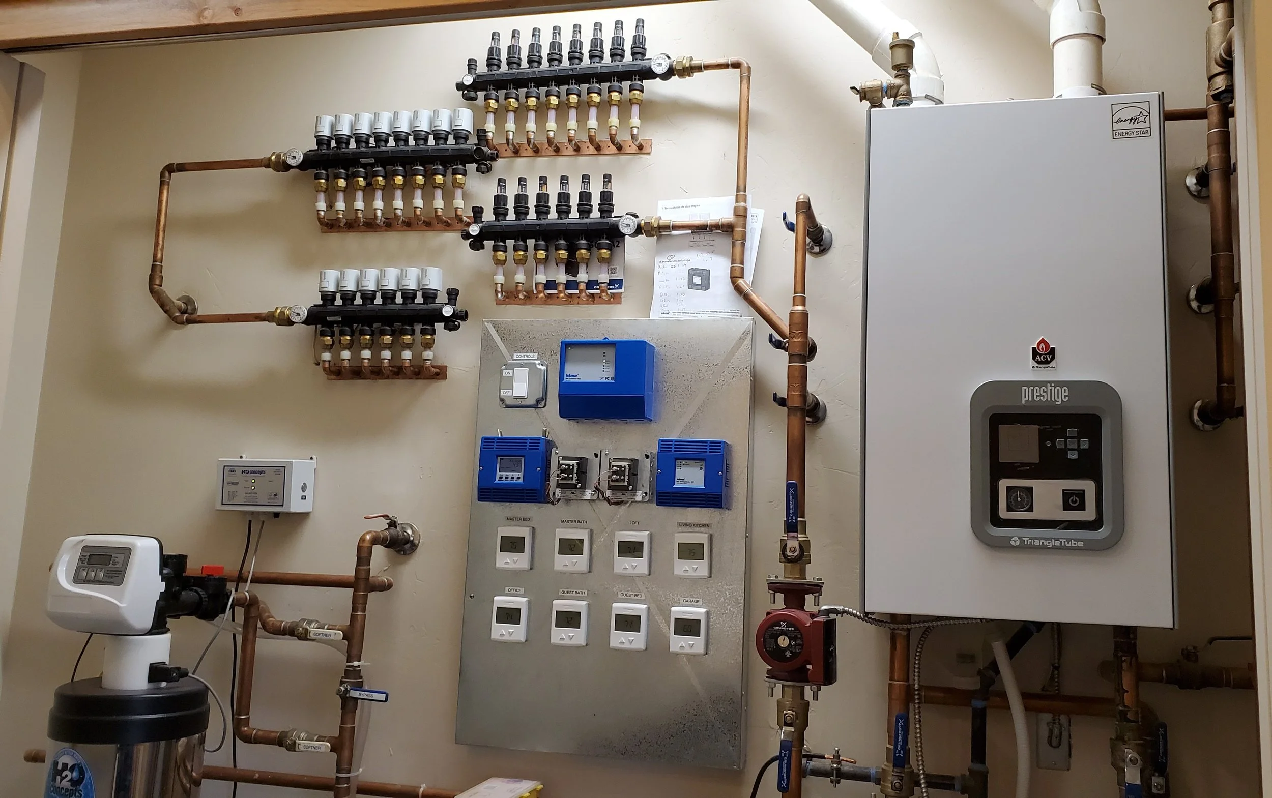 Additionally, the boiler that feeds the radiant heat loops can also feed an indirect water heater to get near limitless hot water.